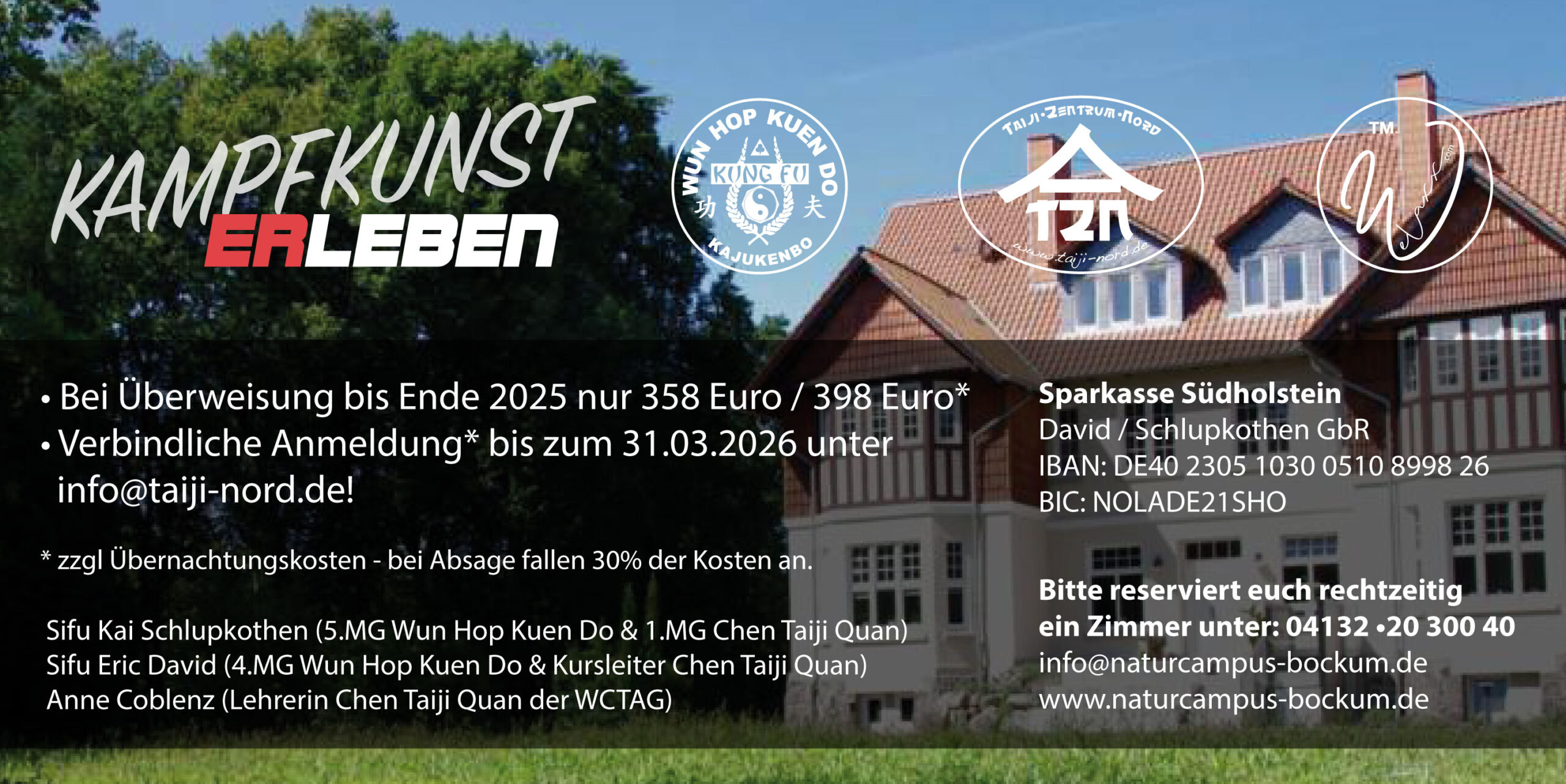 Vom 13.05. bis 17.05.2026 lädt das Taiji Zentrum Nord zu einem außergewöhnlichen Kampfkunstseminar unter dem Titel „Kampfkunst erleben“ auf den idyllisch gelegenen Naturcampus in Bockum ein. Inmitten der Natur bietet das fünftägige Seminar Raum für intensive Praxis, persönliche Entwicklung und ganzheitliches Erleben von Bewegung, Geist und Energie.