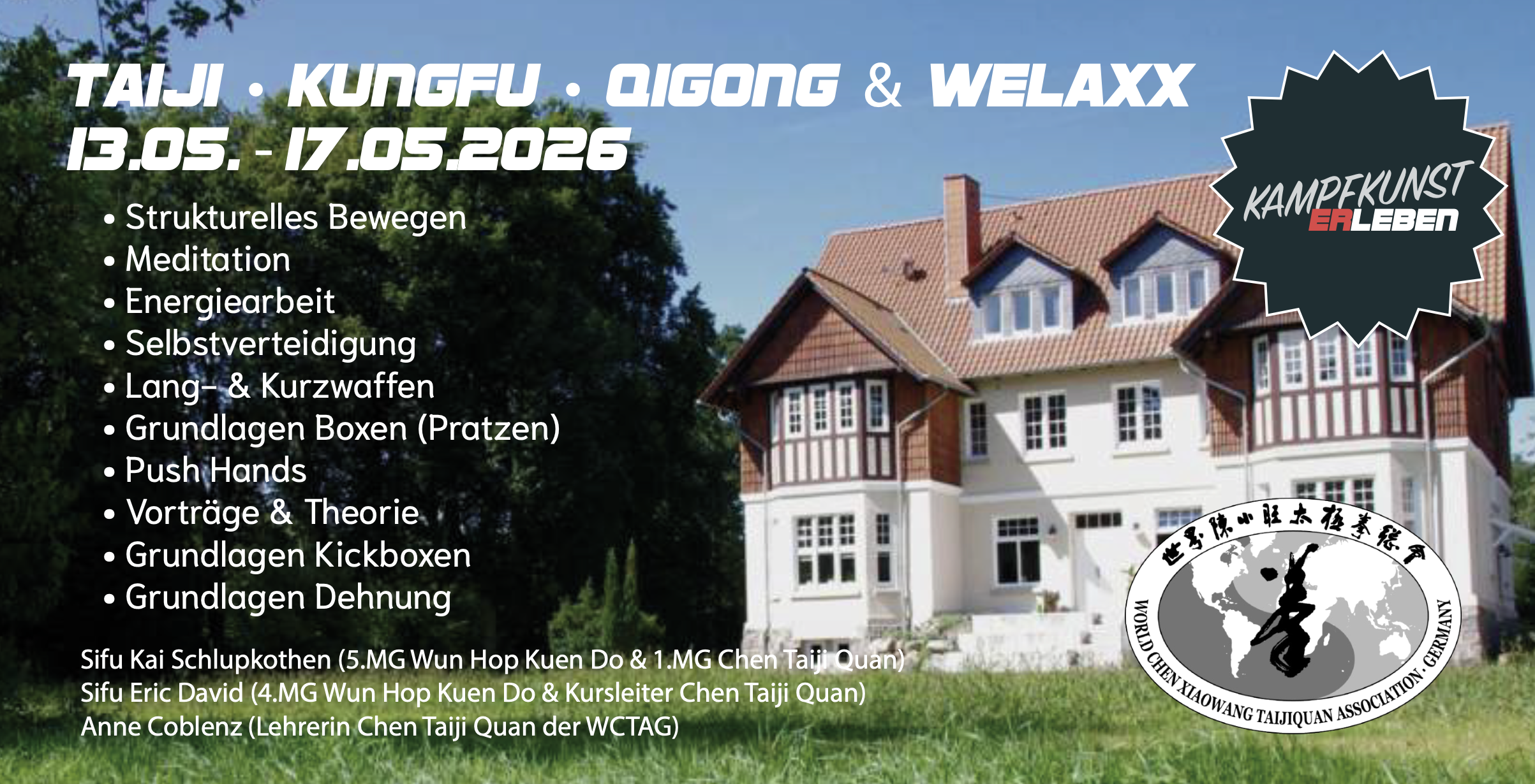 Naturcampus Bockum Bockum 4, Rehlingen, DeutschlandKampfkunst erleben – Intensivseminar auf dem Naturcampus Bockum 13. bis 17. Mai 2026 Vom 13.05. bis 17.05.2026 lädt das Taiji Zentrum Nord zu einem außergewöhnlichen Kampfkunstseminar unter dem Titel „Kampfkunst erleben“ auf den idyllisch gelegenen Naturcampus in Bockum ein. Inmitten der Natur bietet das fünftägige Seminar Raum für intensive Praxis, persönliche Entwicklung und ganzheitliches Erleben von ... Weiterlesen